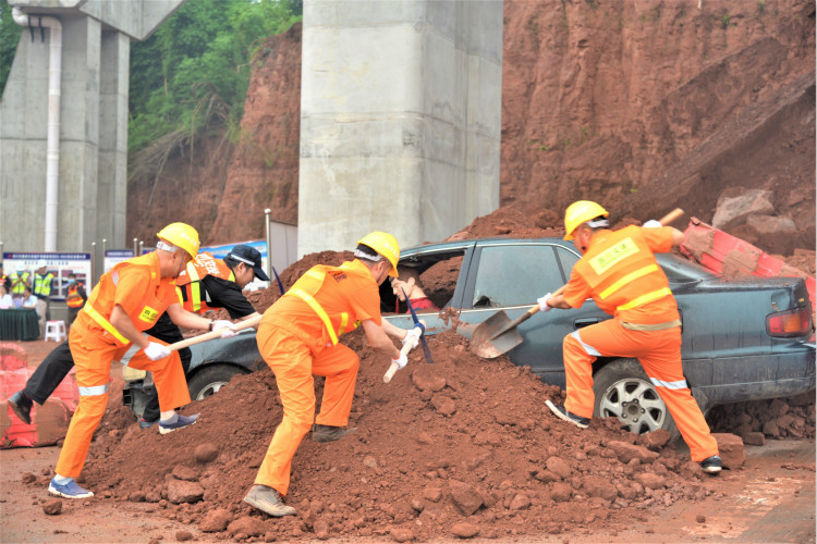 演练模拟成乐高速扩容段落施工边坡因大暴雨垮塌,侵占现有乐山北站出站匝道,将正在施工的桥梁部分墩桩掩埋,并将正在出站的一社会车辆掩埋,导致车辆及车上人员被困,情况十分紧急。各参演方迅速集结、各司其职开展险情报告、现场勘验、交通警示、交通管制、伤员救助、边坡垮方清理、桥梁隐患排查、设施修复等工作,先后触动机具车辆16台,历时1个小时,完成抢险演练。