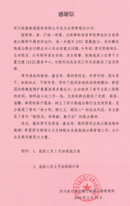 今年初,公司积极响应省交通运输厅高速公路管理局助力提升ETC客服能力的号召,主动担当相继选派3名骨干力量支援12122服务中心,为保障取消省界收费站后全省高速公路网平稳有序运行,及时解决高速公路出行群众关心关注的重点问题提供了坚实保障。3名骨干在岗期间,恪尽职守,充分发挥自身优势,顶住了投诉咨询电话持续增加、疫情防控期间交通住宿不便等多重压力,主动放弃了春节与家人团聚的时间,始终战斗在工作一线,为来电群众提供了专业、优质、高效、温馨、满意的客户服务,展示了成渝公司的企业担当和良好的社会形象。