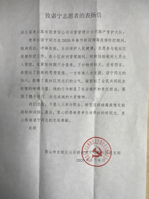 近日,成乐运营分公司路产管护大队收到自眉山市东坡区大石桥街道文忠街社区党支部一封表扬信,特别表扬路产管护队分队长谌宁在疫情防控工作中对社区所做的贡献。疫情无情人有情,一方有难八方支援。在疫情防控阻击战中,谌宁在岗期间恪尽职守,带领队员们做好检疫点保通保畅工作,维护好成乐高速公路的安全畅通;休息时间他挺身而出、冲锋在前,自愿参与社区疫情防控工作,协助封闭式管理的小区做好人员出入管控工作,始终战斗在疫情防控一线,主动保护人民群众健康,用实际行动展示着成渝人的责任与担当。
