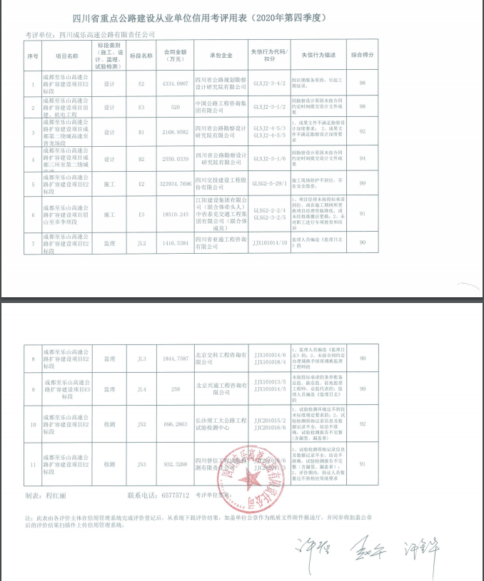关于成乐高速公路扩容项目2020年第四季度及年度从业单位履约考核初评结果的公示