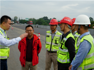 10月11日,成渝公司建设管理部经理岳建洪到成乐扩容项目施工现场督导成乐扩容试验段右幅路面施工质量工作,成乐公司总经理黄文悦陪同督导