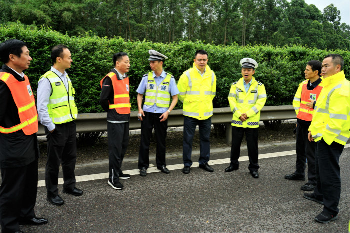 高速交警四支队副支队长罗平,成乐运营分公司总经理石树钢、副总经理訾峰、谢兴华,成乐公司总经理黄文悦、副总经理刘东陪同检查。