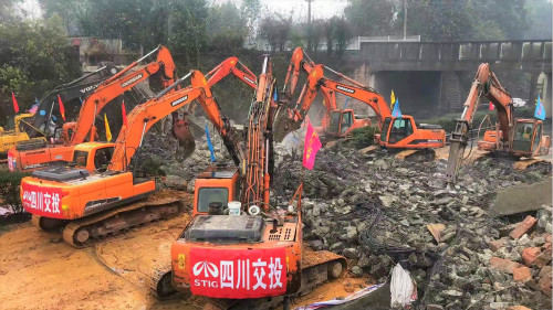 本次施工共拆除上跨天桥多数为车行天桥,与此前拆除工作相比,具有单桥砌筑方量大、桥形结构复杂、桥梁净高偏大、梁体稳定性差等难点。面对重重困难,成乐公司积极发挥一路多方机制优势,研讨制定可行性交通组织方案,同时针对桥体结构不同,逐一梳理制定拆除施工方案,并合理编排投入机具、人员,共投入吊车、破碎头等机具约250余台,机手、焊工等施工人员约600余人,确保拆除及后续路面交安恢复工作顺利进行,成乐高速如期恢复半幅通行。
