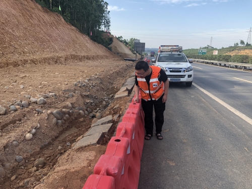 端午即将来临,为确保节假日期间道路的安全畅通,6月19日,成乐运营分公司对成乐高速公路扩容施工路段进行了拉网式安全检查。检查组对扩容施工路段标示标牌设置、水码摆放、已开挖路段安全防护设施设置、施工现场安全员在岗情况、乐山段43处边坡隔离网和25处防抛网完好情况进行了全面检查。检查情况总体较好,基本符合安全生产要求。并要求施工单位对高边坡挖掘后未及时挖通排水沟,存在遇强降雨天气,可能造成排水不畅,产生大面积积水的安全隐患立即进行整改。全力保障汛期和端午节期间道路安全。