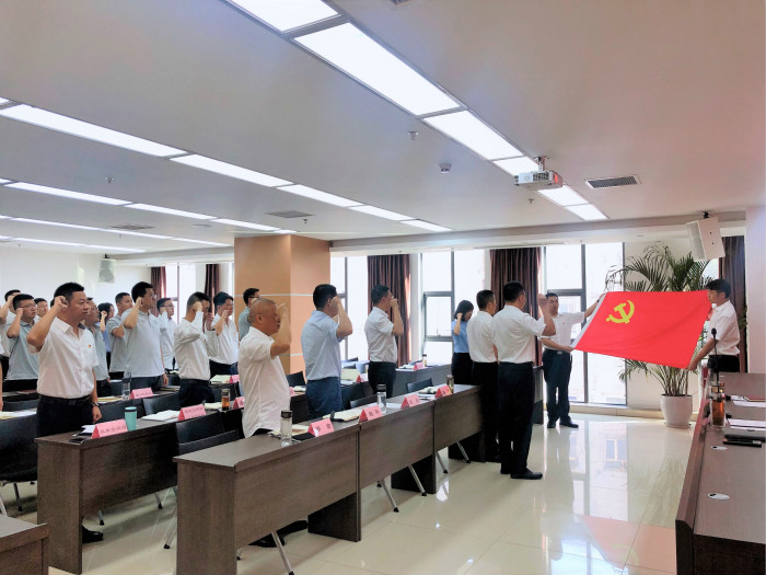 “我志愿加入中国共产党,拥护党的纲领,遵守党的章程……”面对鲜红的党旗,全体党员同志高举右手庄严宣誓,重温对党忠诚的誓言,表达为党的事业奋斗终身的决心。