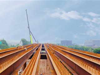 蜀道集团成渝公司成乐扩容项目青龙场枢纽互通G匝道试验桥顺利完成型钢主梁架设